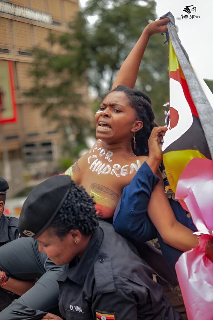 Defiant and unarmed, Kemitooma and her comrades were violently dragged by police during the nude protest. Kampala, 2024. Credit: Matte Derrick