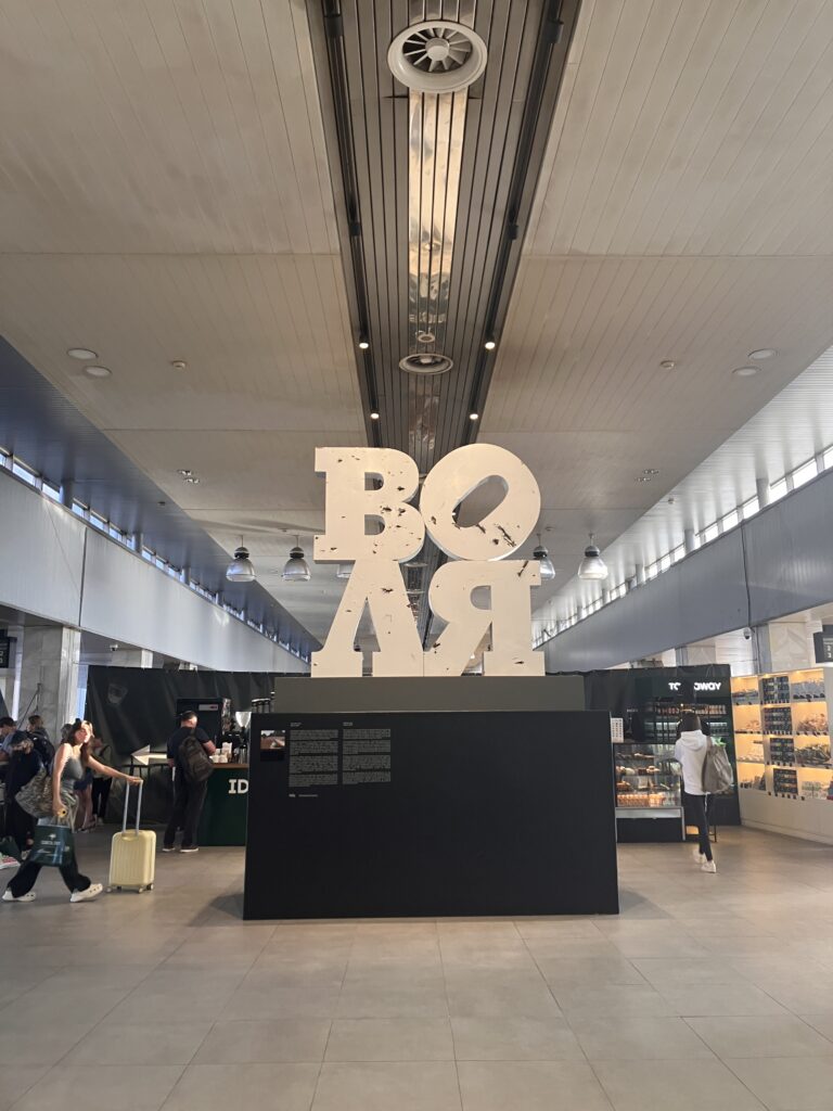 A sculpture of the Ukrainian word “Volia” (Воля), which means both “freedom” and “will,” created from the remains of the street sign of a Liubymivka village in Kherson region, damaged by shelling. Credit: Oleksandra Keudel.