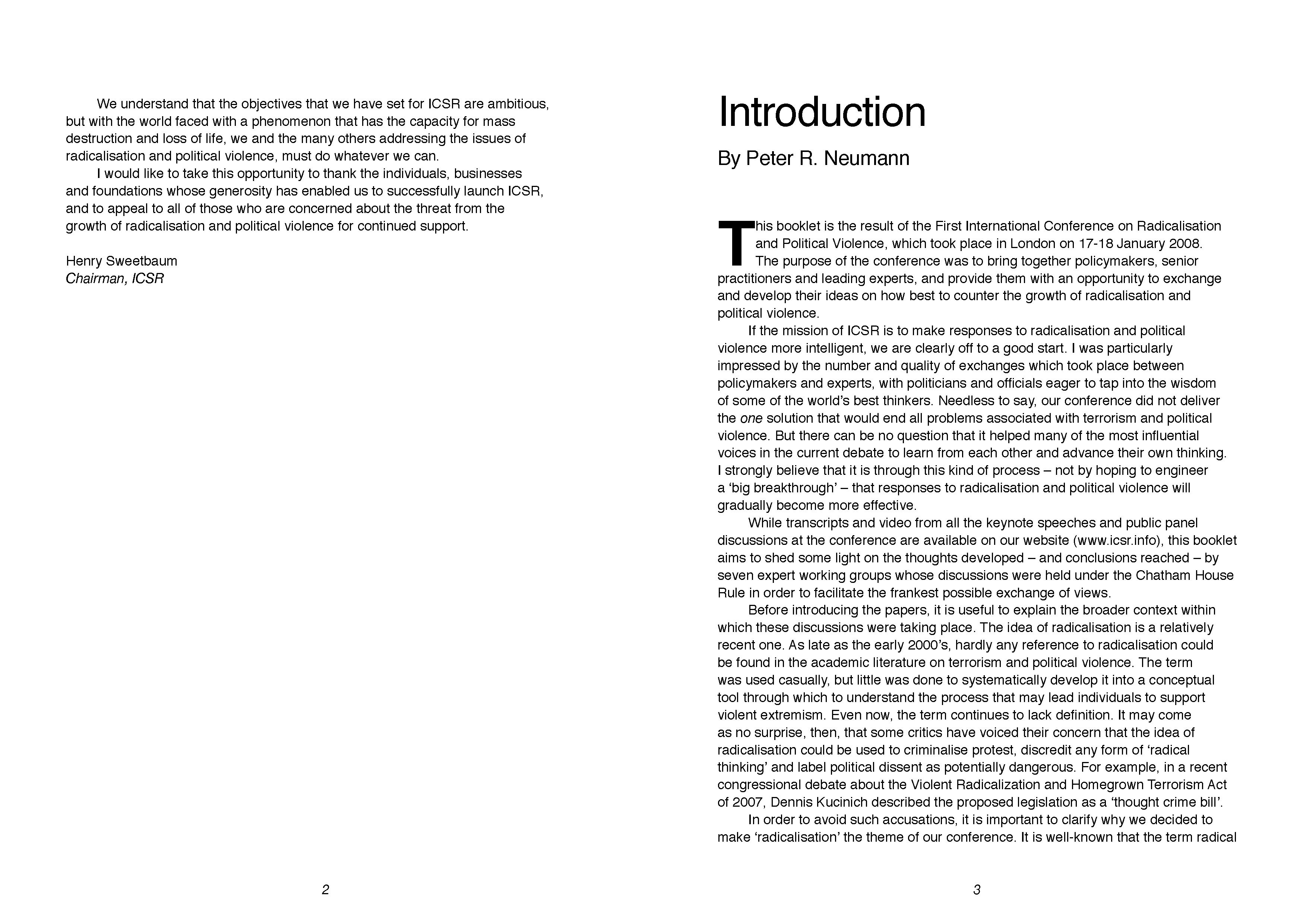 This booklet is the result of the First International Conference on Radicalisation and Political Violence, which took place in London on 17-18 January 2008. The purpose of the conference was to bring together policymakers, senior practitioners and leading experts, and provide them with an opportunity to exchange and develop their ideas on how best to counter the growth of radicalisation and political violence.